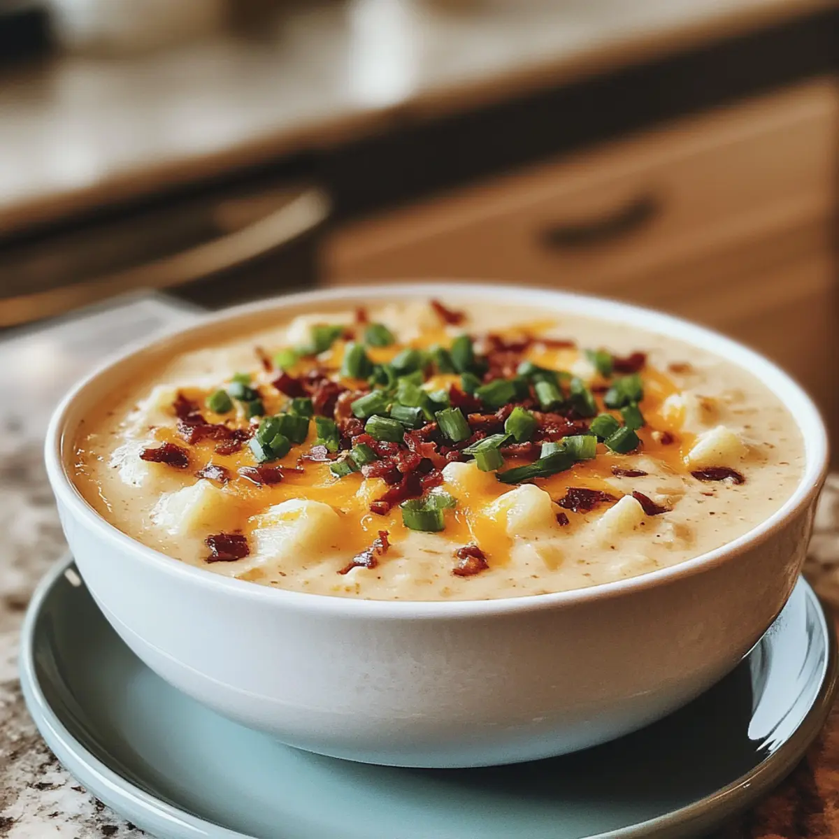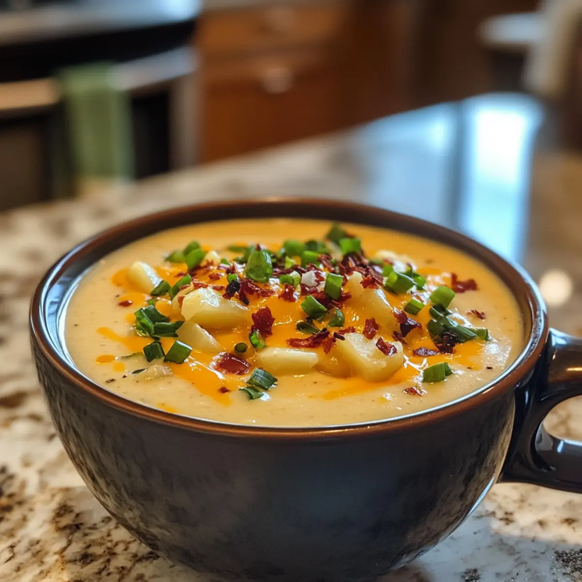 When a craving for something creamy, cheesy, and utterly satisfying hits, this soup never disappoints. Topped with crispy bacon and finished with a sprinkle of fresh green onions, it’s packed with flavor and delightful texture—perfect for family gatherings or simply as a treat for yourself after a long day. What makes it truly irresistible is its ease of preparation; you can whip it up in no time, making it an ideal choice for anyone looking to bring a touch of homemade comfort to the table without the fuss of complex cooking. Get ready to dive into a bowl of warmth that feels like home!